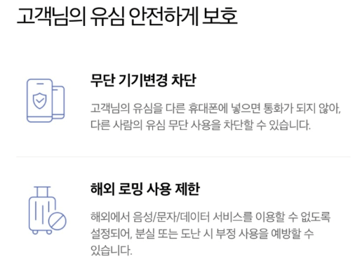 - 심 스와핑 차단, 로밍 제한, 유심 잠금 등 다양한 보안 기능이 있어요